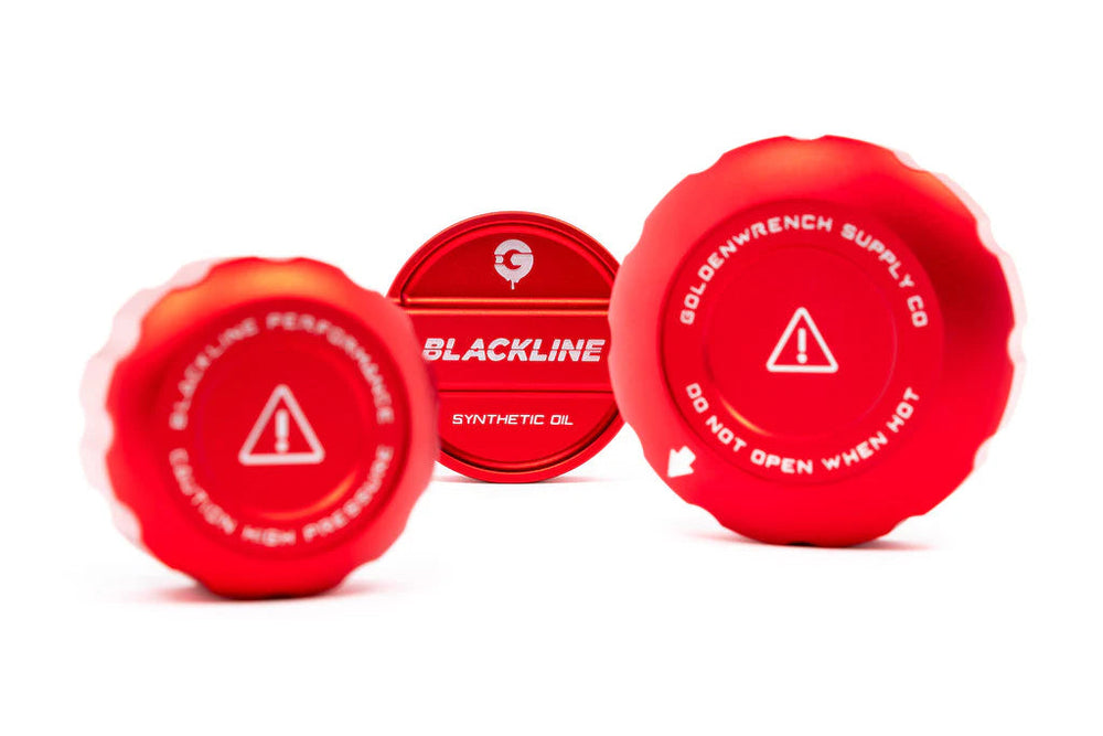 Give the very plain plastic factory oil and coolant caps an upgrade with our brand new BLACKLINE Performance Engine Cap Set. Each cap is CNC formed from T6 Aluminum and anodized with a race inspired red color to compliment the the factory engine cover. All logos and decorations are finalized through our precision 3D milling process, machined into each cap for the ultimate premium finish. The BLACKLINE Performance Engine Cap Set will fit most vehicles equipped with a S63 or S68 Engine. Each cap set comes with a Billet Oil Cap and Coolant Tank Cap Cover(s). These are not a full cap replacements. The Billet Cap Covers affixes to the top of your factory caps installing easily in minutes.